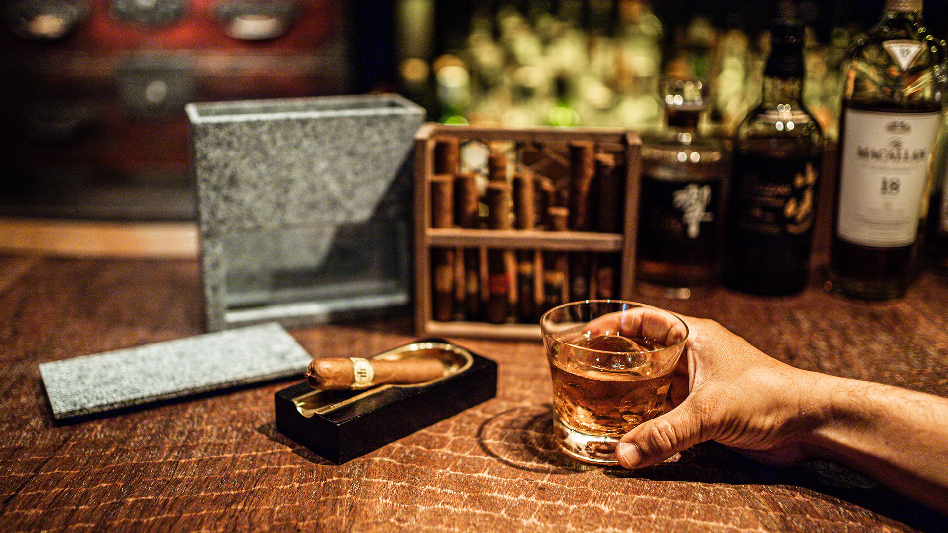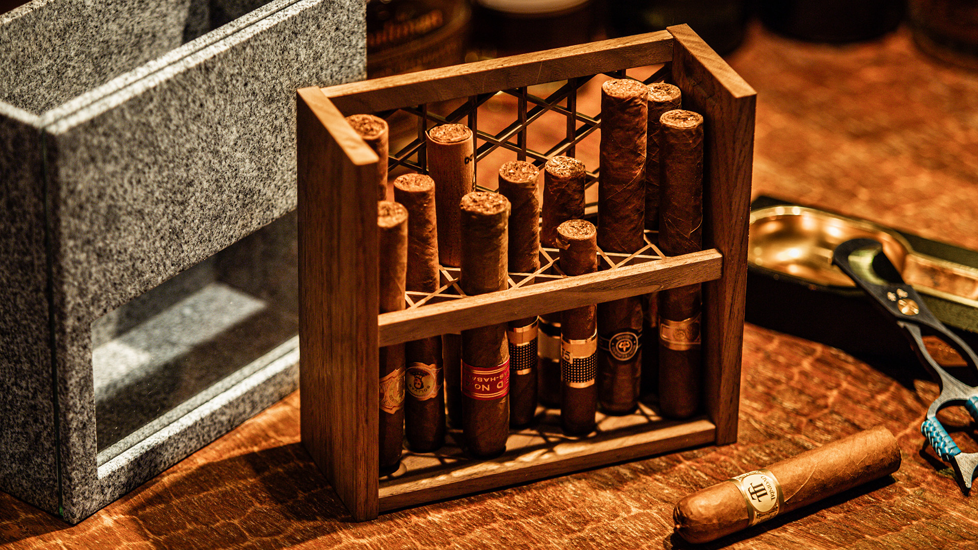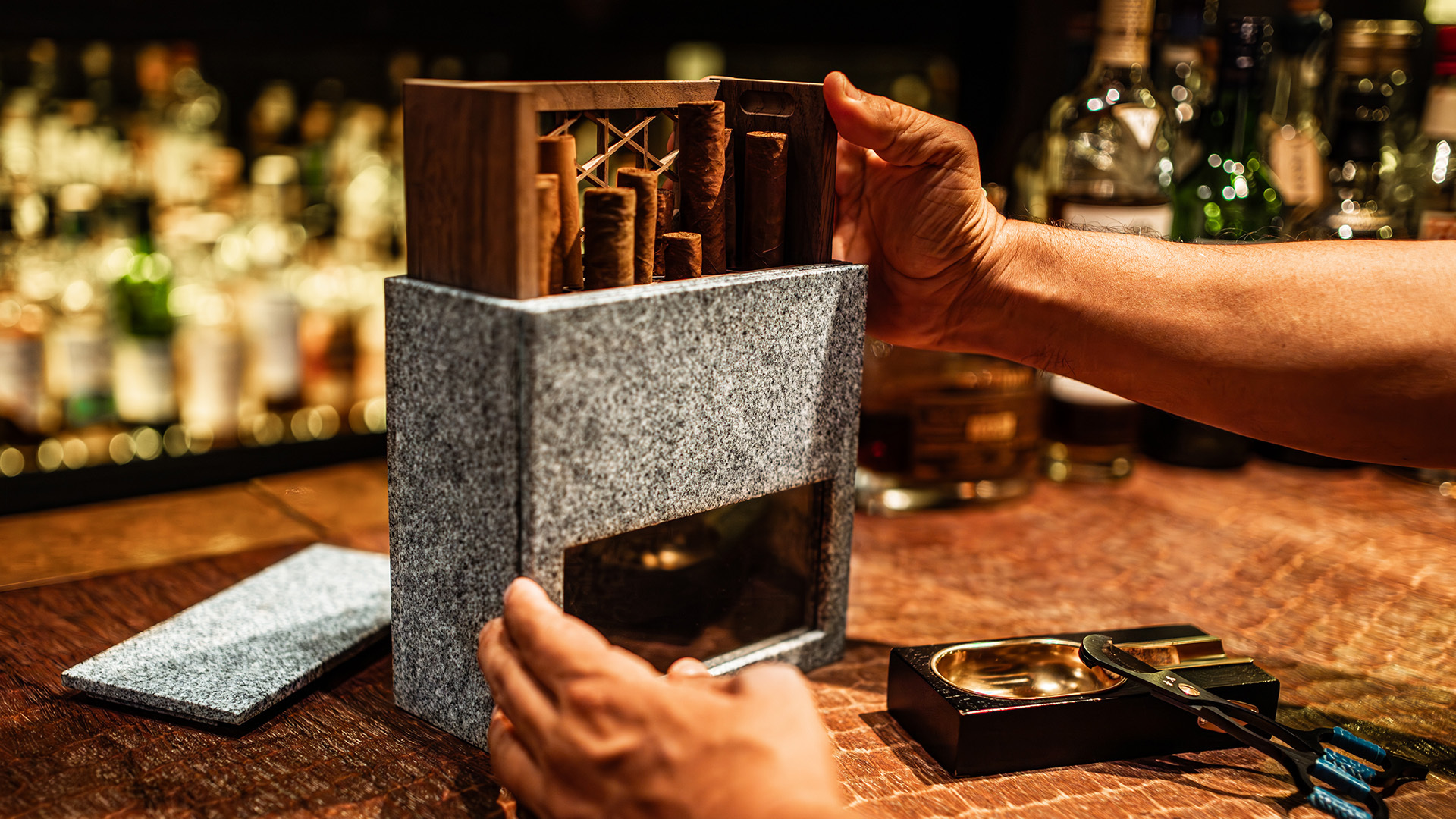 そのずっしりとした石の塊から、静かにシガーキャビネットを引き出すと、庵治石の力強い質感と対をなすように、ウォールナット材に施された繊細な組手細工(くでざいく)が現れます。職人の手仕事が織りなす幾何学模様。指先でその美しさを確かめながら、葉巻をゆっくりと取り出す───葉巻を味わう時間は、この上質な儀式から始まります。