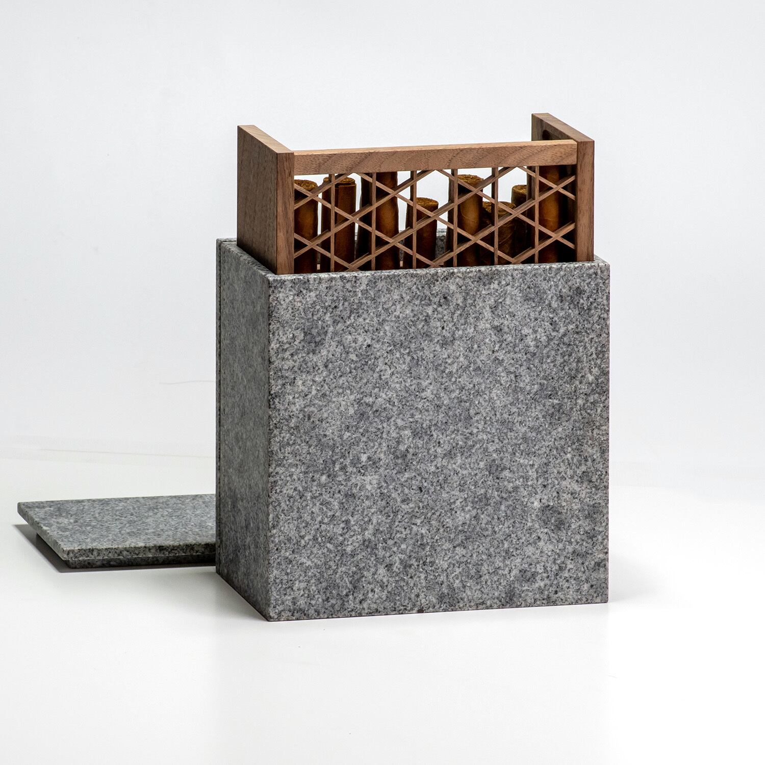 組手には一般的に杉やヒノキが用いられますが、この製品では葉巻の香りを損なわないことと、庵治石の重厚な質感との調和を考慮してウォールナット材を選択しています。