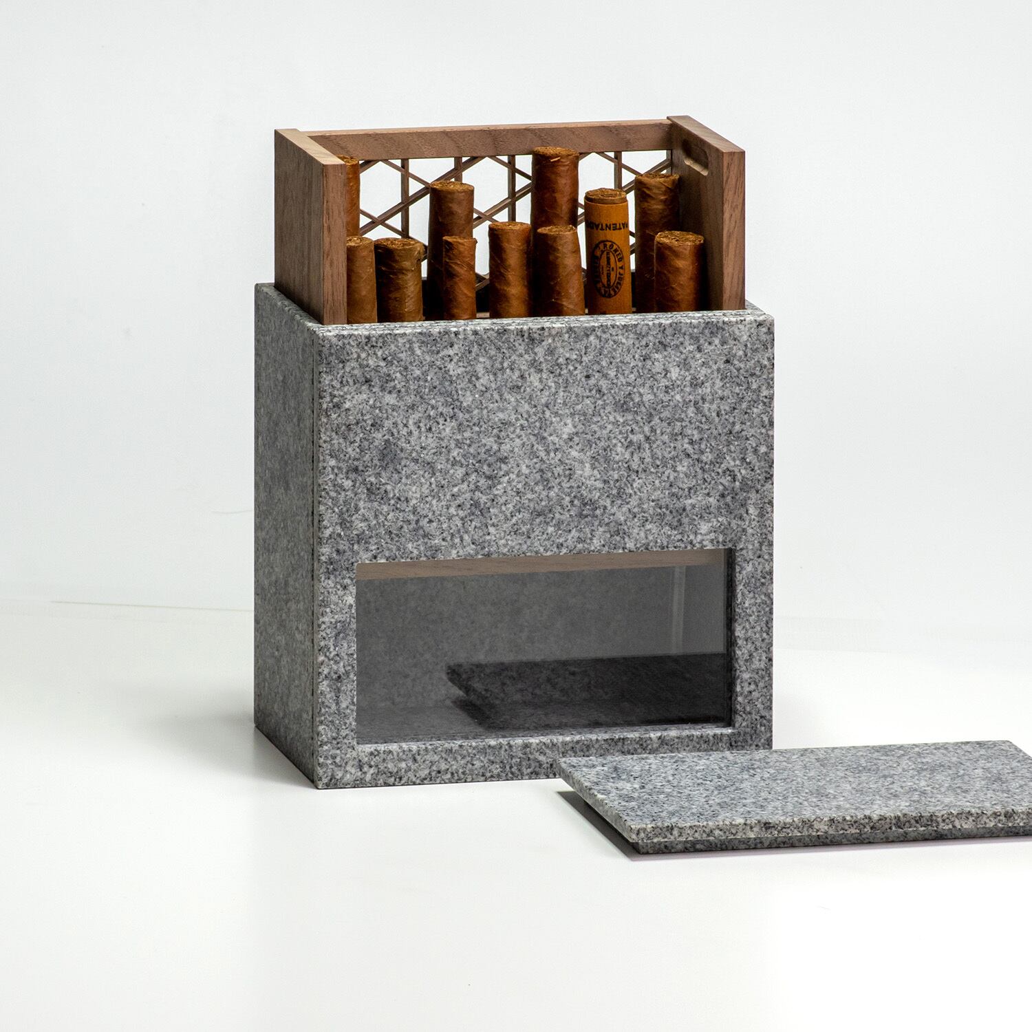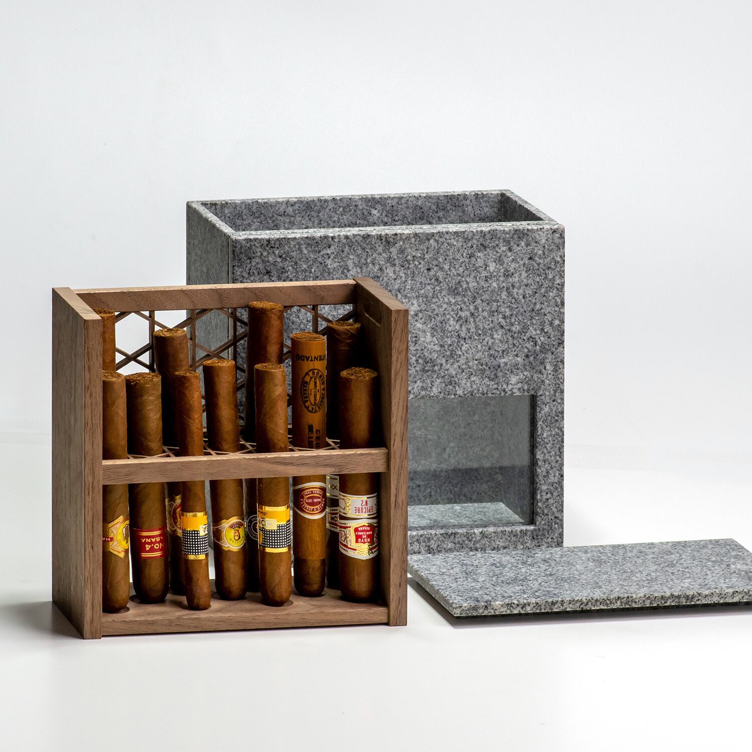 While softwoods are common, walnut was chosen here to preserve cigar aromas and match the stone’s gravitas.