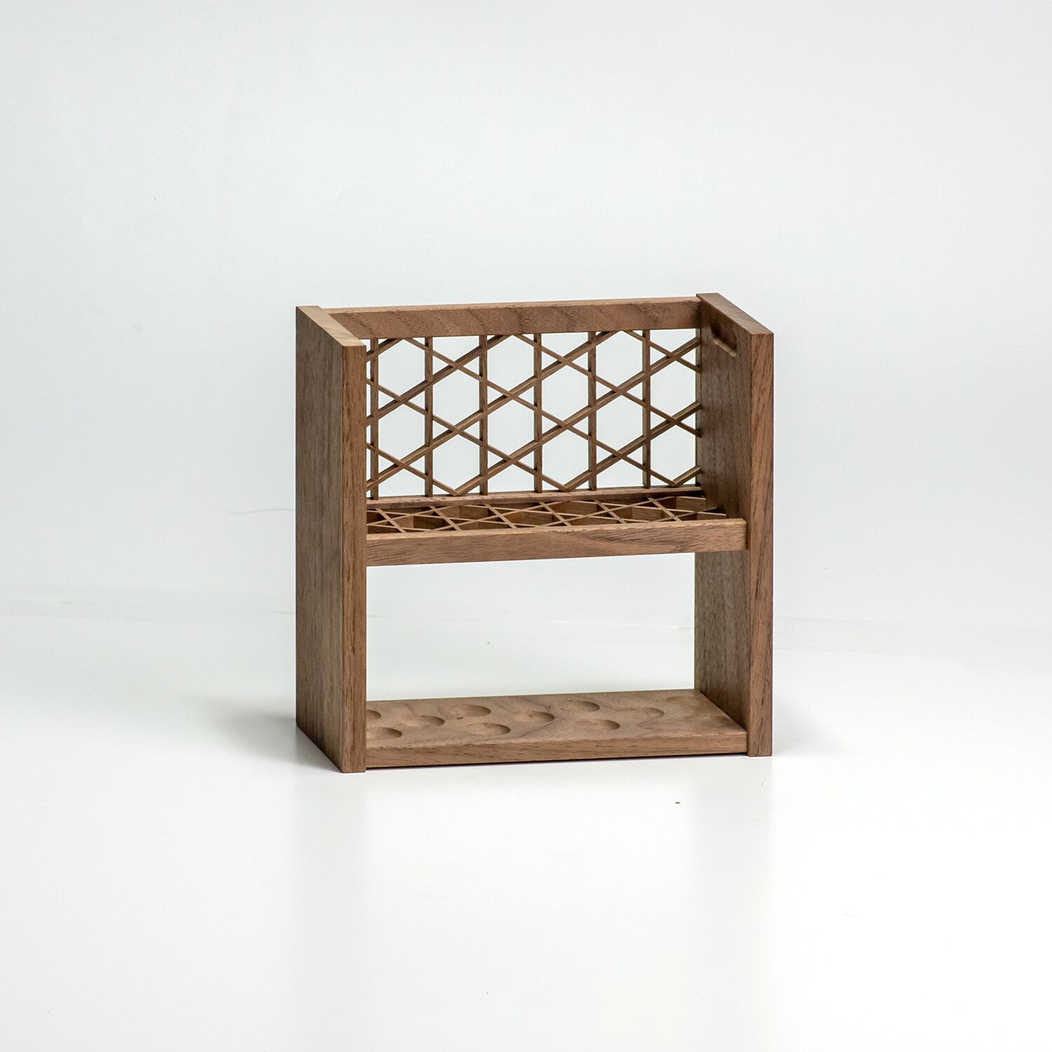 The cabinet is shaped using Kude-craft, a traditional Japanese woodworking technique from Kagawa. It features interlocking geometric patterns made without nails—a method brought to Japan with Buddhism in the 6th century and passed down through generations. In Kagawa, it survives as kude shoji, a designated traditional craft.
