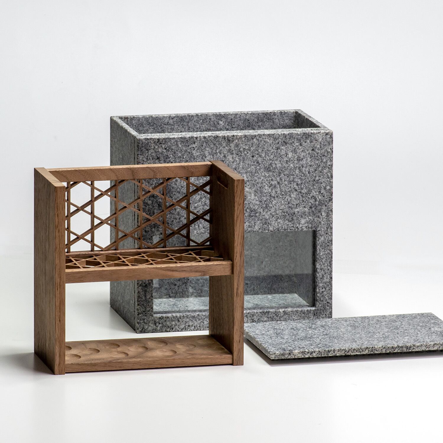 This product unites the refined techniques of two traditional crafts: Aji Stone masonry and Kude joinery.